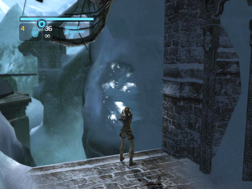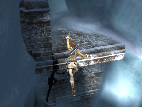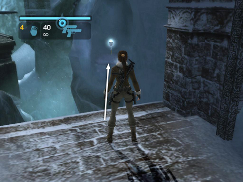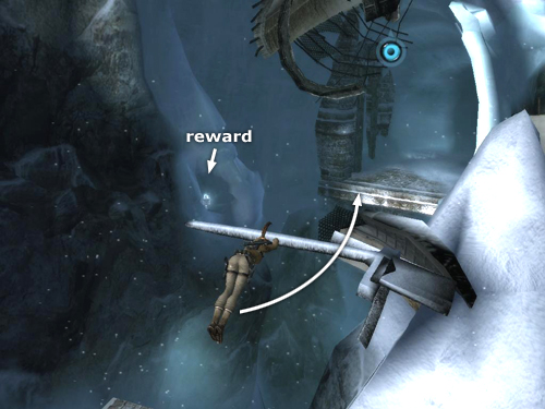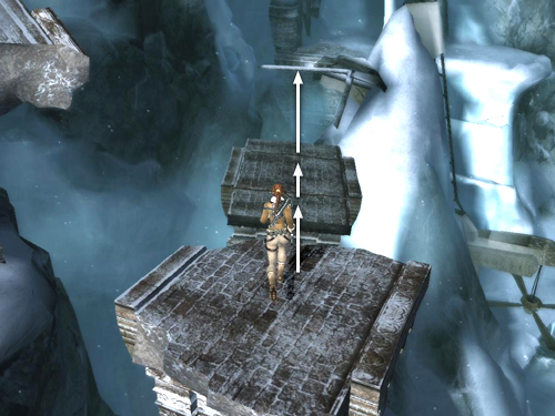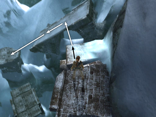 Just beyond the ice tunnel and CHECKPOINT 3, turn right and jump across the gap to grab the top of the stone pillar. Pull up.