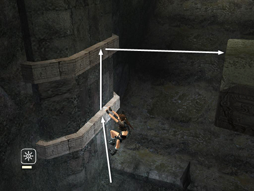 The slope here is too steep to climb. So climb the carved stone handholds on the left and jump back to grab the ledge behind. Pull up.