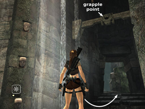 Once Lara is standing on that ledge, turn to face the top of the slope, jump off the ledge and immediately press Jump again to snag the metal grapple point above. Then either swing to the flat spot at the top of the slope and climb onto the ledge on the right, or shorten the cable and swing directly to that ledge. Note that Lara can't climb up on the left side of the ledge where it has crumbled, only on the right where it's intact.
