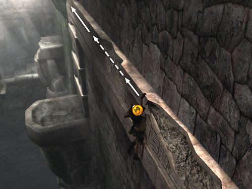 Cross over the top of the statue's head. Jump the gap to land on the ledge beyond. Here you can grab onto a narrow shelf that runs along the entire wall. Climb to the left and around the corner.