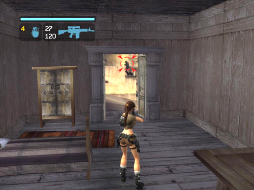 Kick open the door leading from the room where the sniper and his buddy had been lurking. This gives you a view out onto the next street. Don't rush out. There are 5 or 6 more mercenaries ahead—2 on the ground and either 3 or 4 on the rooftops and balconies. They're armed with rifles and grenades.