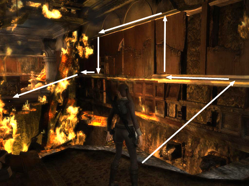 Stand at the edge of the hole in the floor facing the narrow light-colored band of molding on the wall ahead. (This screenshot shows the spot.) Jump across the flaming pit to grab the molding. Climb to the left and then jump up to grab the strip of molding above. Climb to the left some more until Lara is hanging above another strip of solid molding. Press Crouch to drop and grab it. Continue climbing to the left. When you can't go any farther, press and hold Back to lean away from the wall. Then press Jump to leap off and land on the solid floor behind.