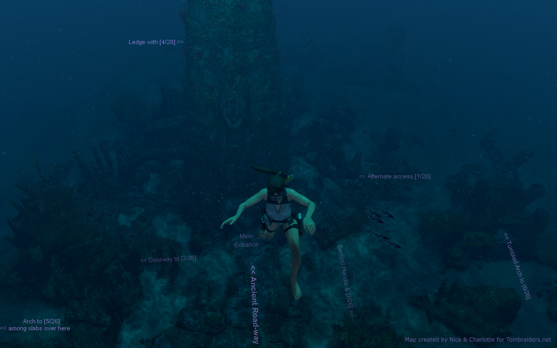 Now turn around so the stone tower is behind Lara. Swim out toward the right edge of the ruins and look for a tumbledown structure with long, rectangular stone slabs. The entrance is located on the side farthest from the stone tower beneath those slabs. (You can see it in this series of screenshots.) Swim inside and follow the dark tunnel to a room with a sloping pile of sand. The treasure (5/26) is lying in plain sight. Grab it and swim back outside.