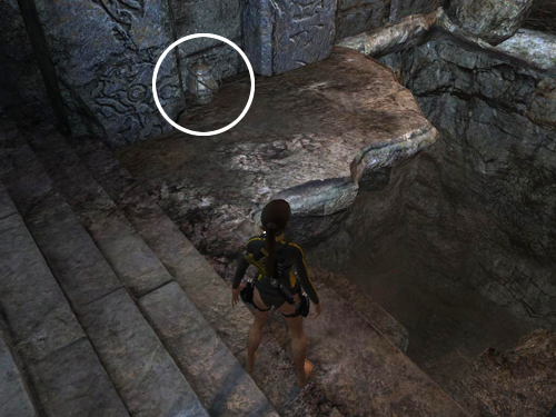 If Lara falls into the pit before getting the treasure, climb back up to the small ledge using the step on the back of it. Once you have the treasure, continue along the hallway.