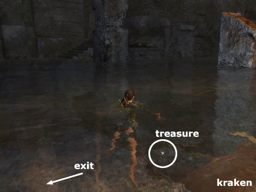 LEAVING THE (DEAD) KRAKEN POOL: When you're ready to move on, jump into the pool and swim toward the exit, which is directly behind the kraken's corpse. Climb out of the water on the small staircase to the right of the exit and use the switch to open the doors. Climb over and go through.