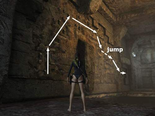 Follow the hallway up the stairs and on to a deep pit. To get across, approach the left wall and press Up to grab the knobby stone handholds. Climb upward then diagonally up and to the right, then right again, then diagonally down and to the right (as shown in this screenshot). When Lara runs out of handholds and won't go any farther, jump to the right to grab on to the wall beyond. Climb to the right and downward. Make sure Lara is over solid floor before dropping down, otherwise she'll fall into the pit.