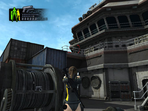 MAIN DECK – CARGO CONTAINER AREA: Pick up the first aid kit lying on the deck just ahead. Before rushing into battle, be sure to equip a more powerful weapon if you haven't done so already. (I like the assault rifle here, but use what you like best. Remember, you can switch between pistols and secondary weapon on the fly using the Change Weapon key. Use the PDA to change secondary weapons.)