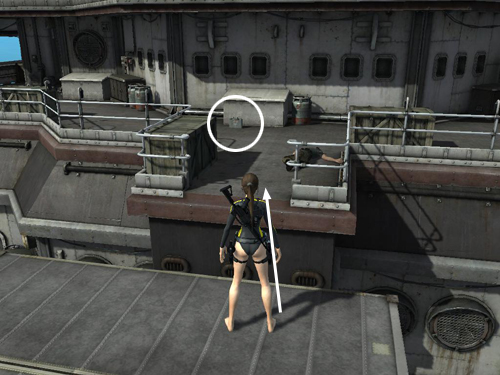 UPPER DECK: From the spot where the fourth mercenary was, you can go to the left or right to reach the stern. You may want to go one way, clear out the enemies there, and then backtrack and go the other way. There's one mercenary hiding behind the crates in the corridor to the right and 2 more men in the corridor to the left. You may be able to take out one or both of them with a well-aimed grenade. Take care when aiming so the grenade doesn't stick to the wall right next to Lara. I learned that one the hard way. ;)