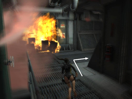 Go through the open doorway ahead (i.e., the one without the green lights one either side, which is where you came in) and follow the hall. Where flames block the way, go to the right. Turn right again at the next corner. The doors ahead open automatically, leading into a smoke-filled corridor. Continue forward.