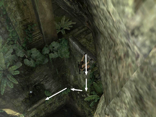To get back to the path, turn around so the cliff from which you just jumped is above on Lara's left. Then look ahead to spot the sunny ledge where you killed the spiders. Take a running jump down to it. Then repeat the climb up the handholds to the path. (Again, refer to the screenshots if you need them.)