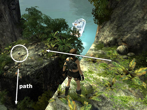 WIDE ROCK LEDGE WITH TREASURE: If you're not interested in collecting treasures, skip this paragraph and continue along the overgrown path. Otherwise, look ahead and to the left. Down below you can see the boat and, a bit closer, a wide, flat ledge with something sparkly lying in plain sight. Take a running jump from the path to clear the wide gap and land on the ledge (as shown in this screenshot). This is quite a long jump, but if you roll as Lara hits the ground, she'll take little or no damage. Pick up another treasure (4/30).