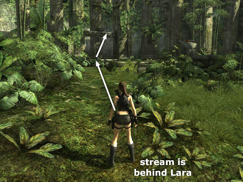 CLIMBING OUT OF THE STREAMBED: Climb onto the horizontal stone beam between two of the square columns. Walk to the end of the beam and jump up to grab the handhold above on the column. (Check the screenshots if you need them.) Climb around to the left side of the pillar and then jump back to land on the small stone beam projecting out of the column behind. Walk along the beam toward the column and then jump up to grab the handhold above. Climb around to the right side of the column and get ready for a tricky jumping sequence.