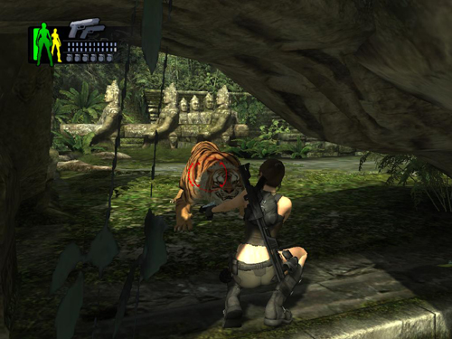 If you prefer a less confrontational approach, here are a couple of alternatives: First, when pulling up into the low opening, move forward slowly and stop as soon as Lara stands up. Then creep forward just a little more, turn right, draw pistols and hold Target Lock to aim at one of the tigers near the ruins (as shown in this screenshot). Now start firing. Even though the targeting reticle remains gray, some of your shots will connect, and eventually the tiger will fall. You'll know it's dead when the gray reticle disappears. When the first tiger dies, the second will charge across the courtyard from it's spot on the high wall opposite the opening where you pulled up. Andy M. suggested sidestepping to allow the charging tiger to run off the ledge. I didn't have too much luck with this, but I found that if you crouch and move back under the tree branch (as shown in this screenshot), the tiger can't reach Lara, and you can easily kill it with pistols. Now move out into the open and you'll only have one tiger to fight.
