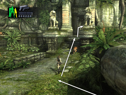 ENTERING THE TEMPLE: Cross the courtyard where you fought the tigers and go up the stairs into the temple. Follow the rubble-strewn corridor to the edge of a deep pit.