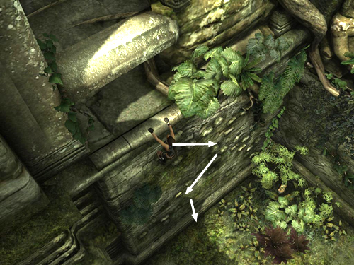 Hang from the edge of this ledge and drop to grab the narrow, broken ledge below. (The following sequence is illustrated in this series of screenshots.) Traverse to the right. (Don't worry about the gap here; Lara will move right past it.) Continue traversing to the right out onto the jutting stone beam. Pull up to stand on it.