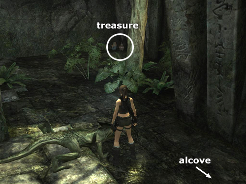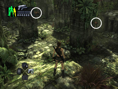 TREASURE IN FAR LEFT CORNER OF RUINS: Turn around and pick up the health potion in the bushes just ahead. Then head toward the other side of the ledge, but watch out because another pair of nagas, one of each color, tries to ambush Lara from behind. If you face the alcove where you dropped down and back up toward the wall, you'll be able to see them coming.