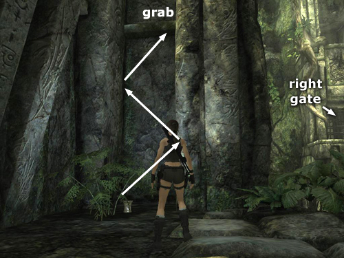 Hang from the edge of the ledge where you climbed up, traverse all the way to the right toward the wall. Then jump back to grab the small L-shaped handhold on the carved wall panel. Climb to the corner and press the direction key or analog stick to make Lara lean away from the wall toward the pointed pillar. Jump to land there.