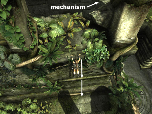 NOTE: I found this section a bit temperamental in the PC game. Unless Lara was standing in just the right spot, no amount of pulling would topple the statue. So if you're having the same problem, refer to the previous screenshot, which also shows the proper positioning for pulling down the statue. Also try tapping the Interact key repeatedly instead of just holding it down. If all else fails, try this: Open the main menu, select Audio/Visual > Display settings, and then turn on VSYNC.