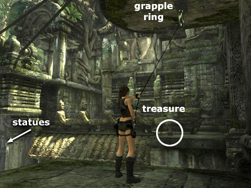 SMALL ROOM WITH A HOLE IN THE FLOOR: Here you'll see a pair of lion statues and a larger cobra or naga statue with a metal ring on it. (The clay jars are all empty.) Stand facing the naga statue across the square hole in the floor. Grapple the ring and step off the edge. Then rappel down the side of the shaft into the hall below. Press Duck to release the cable.