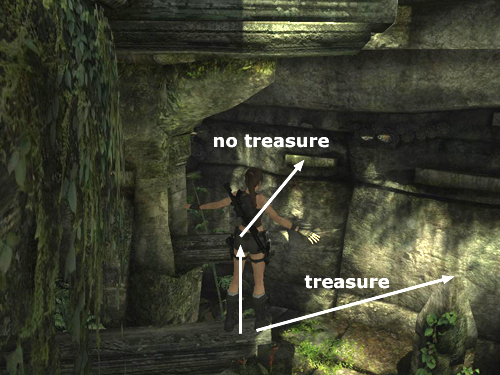 Climb the rough handholds on the square column as you did before getting treasure #13. Before jumping across to the ledge, shoot any stray spiders lurking there. Then repeat the jump with saving grab and pull up onto the ledge next to the one where you got the treasure.