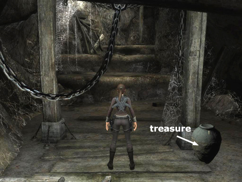 TUNNELS: The level begins in the rough, cobweb-strewn tunnel beneath the crypt. Break the large urn on Lara's right (shown in this screenshot) to find the first treasure (1/13). Vault up onto the ledge with the vertical wooden pole and you'll find another breakable jar, also containing a treasure (2/13). (Again, here's a screenshot, though it's pretty obvious.)