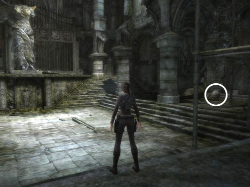 Cross to the right side of the room (i.e., right when Lara's back is to the entrance and she's facing the stone angel) to find another breakable urn containing a treasure (5/13). (This screenshot shows the spot.)