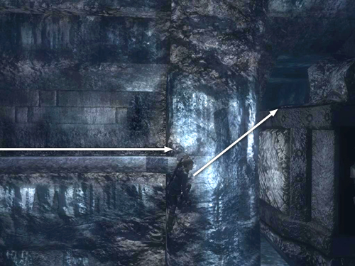 Climb along this handhold to the left. Jump across the gap where the ledge is broken and then jump straight up to grab the edge of the rough opening above. Pull up into a small, dark tunnel. Follow it to the end to emerge in another small room with an eitr pool. (This is the one labeled ROOM 6 on the map above.)