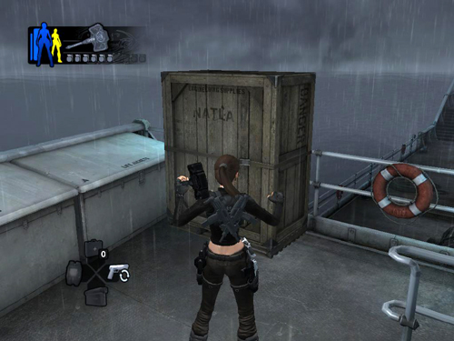 UPPER DECK: As on the ship in the Mediterranean, you can go to the left or right to reach the stern. In either case, you'll encounter 2 more men lurking behind the wooden crates stacked along the side walls. You can destroy the mercenaries' cover by blasting the crates, but that means the bad guys can also target Lara more easily. So take them out quickly and continue moving toward the back of the boat.