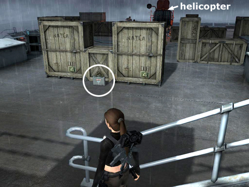 HELIPAD: Descend either set of stairs toward the helipad. Three mercenaries surround the chopper but come toward Lara when she reaches the deck. They'll try and use the wooden crates for cover, but you can easily blast those out of the way. There's a convenient first aid kit on the floor just in front of the crates in the middle of the deck. (It's shown in this screenshot.)