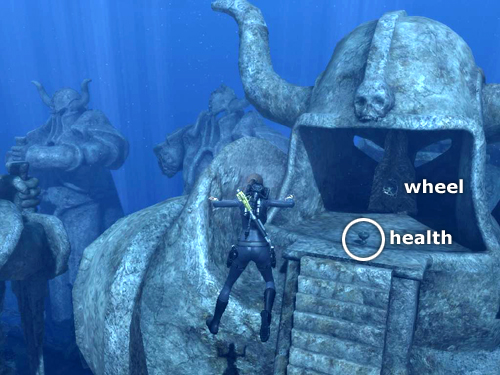 Swim across the road to the third statue in the row on the right (i.e., the one closest to the building on the right side of the road when facing the building). This statue needs a bit of repair before it will function. Swim down to the sea bottom between this statue and its neighbor. There you'll find another health potion and 2 enormous gears. A blue glow emanates from the carved runes on the gears when Lara approaches. This should give you a clue about what to do.
