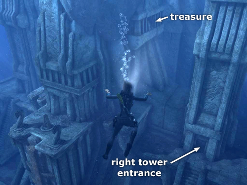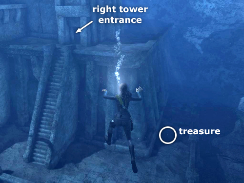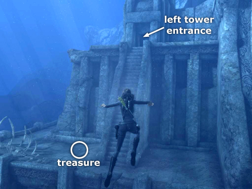 LEFT TOWER: There's another treasure (5/30) on the flat ledge at the bottom of the long flight of stairs leading up to the tower entrance. The treasure is a bit hard to spot from a distance, but swim between the bleached rib cage and the stairs and you'll see it glistening on the sand. (It's also circled in this screenshot.)