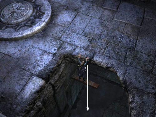 Instead of climbing back down, face the smaller hole in the floor so the circular carving is on Lara's right. Then step off to hang from the edge of the hole (as shown in this screenshot). Drop into the water below.