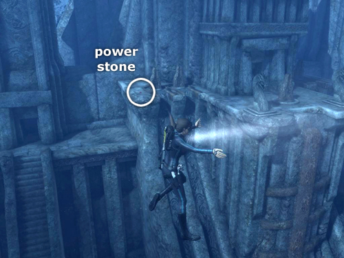Swim to the ledge above on the right (i.e., to the right upon exiting the tower, left if facing the ruins). Place the remaining power stone(s) in the niches. Doing this activates the right side of the drawbridge mechanism, causing the runes on the face of the building to glow red.