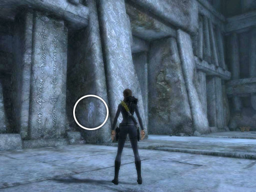 Also, take note of the elaborate symbol carved in the stone on the right outer edge of the door frame. (It's on the left when facing the door. This screenshot shows the spot.) When Lara approaches it, it glows blue and emits a resonant sound, indicating that her Thor powers can activate it. However, it's not necessary to do that now. This is only one of a series of symbols you'll need to activate in sequence later on.