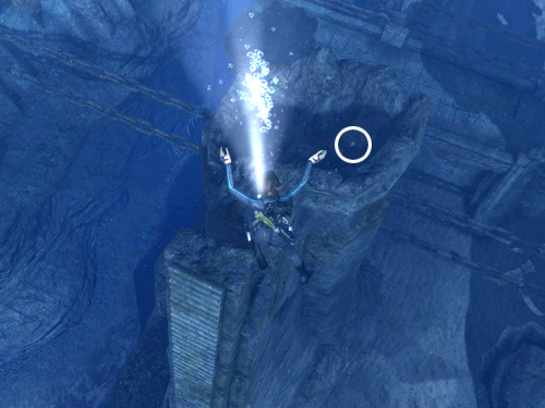 TREASURES ON THE SEA FLOOR: Between the statues and the building, there's a dark trench—presumably the moat that the drawbridge once spanned. Swim down into this trench. When you spot the bones of a shark or whale on the bottom, head to the right. (These screenshots show the path to the three treasures here.) Swim along the bottom of the trench until you see a shadow on the left wall of the trench cast by the statue above. Swim toward it and look on the ground for a shiny treasure (2/30). It's hard to see in the gloom, so turn on the Utility Light if you haven't already.
