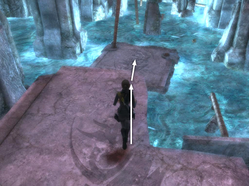 Here's how to do it: Go to the first symbol, to the right of the exit. Press Interact to activate it. You'll know it's "on" when it glows blue and emits a resonant sound. As soon as you regain control of Lara, turn right and sprint across the ledge toward the part where it juts out over the pool. As you near the edge, slow to a normal run and veer to the left. Then take a running jump toward the support pillar on which the second symbol is carved. If you angle the jump correctly, Lara will smack into the pillar and slide down to the little island. She'll lose a little health in the process, but she'll end up standing right in front of the second symbol so you can activate it quickly.