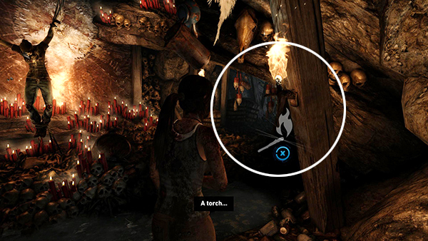 CREEPY ALTAR ROOM: After Lara regains consciousness and the camera turns to show her hanging upside down in a scavenger cocoon, you'll gain control. Alternate pressing Left and Right to make her sway back and forth until you're able to nudge a second cocoon hanging on your right. Keep swinging to push this cocoon into the fire. As it ignites, the blaze spreads to some cloth wrapped around a pole to your left. Swing Lara into this fire to burn away her cocoon so she drops to the cavern floor.
