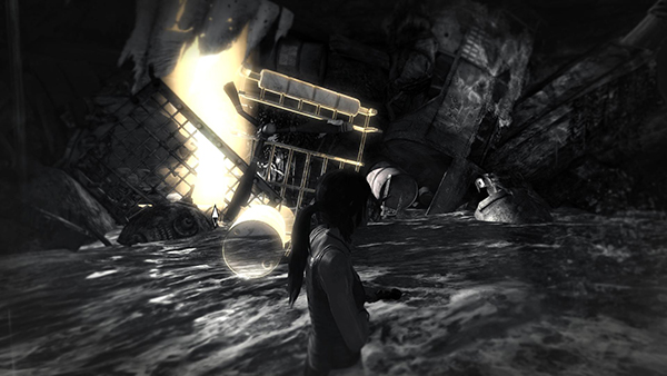 SMALL ROOM WITH DEBRIS AND WOODEN LEDGE: Here the game shows you how to use Survival Instinct. Press the button indicated (Q on the keyboard, L2 on the PS3, L1 on the PS4, LB on the Xbox) to reveal objects in the environment with which Lara can interact. (screenshot) Release the button and continue moving to return to normal view.