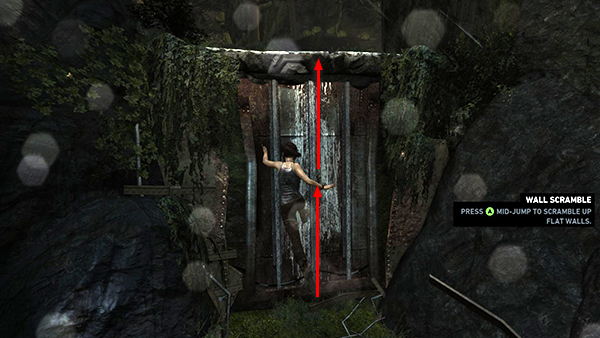 Continue along the narrow path above the ocean. When you come to the painted, wooden wall, follow the on-screen prompts to "Wall Scramble." Move close to the wall, press Forward, Jump, then quickly Jump again to climb up. (screenshot)