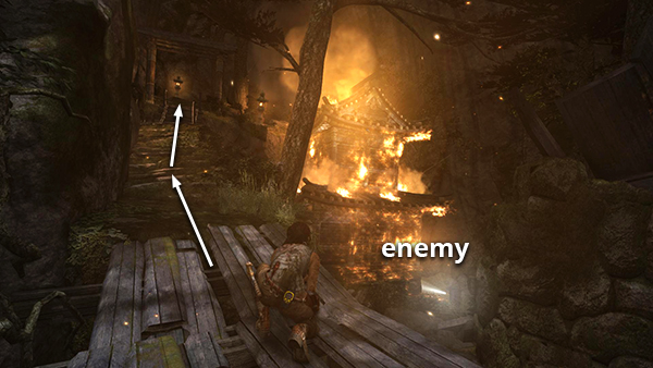 Soon you'll notice Lara go into a stealthy crouch, and an on-screen message explains how to do a silent kill with the bow. While hiding behind the wooden wagon, hold the Aim button to peer out just enough to target the enemy on the ledge ahead. Press Zoom and then adjust your aim if necessary. Then Fire. (screenshot) Loot the body for salvage and a few bullets. Then scramble up the wooden wall onto the ledge where the bad guy was.