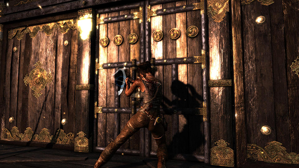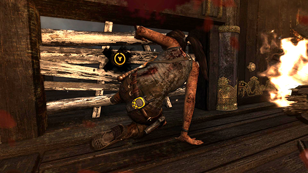 THROUGH THE FIRST BURNING BUILDING: The way back down the hill is now blocked by flaming debris. That's OK since there are no items down there anyway. Climb the steps to the building at the end of this open area and use your axe to force open the ornate wooden door. (screenshot) When you get it open, enemies arrive and attempt to burn the building with Lara inside. Cross the room and follow the on-screen prompts to press the Melee button several times in order to kick out the boarded-up opening. (screenshot) If you hesitate, Lara succumbs to the heat and smoke.