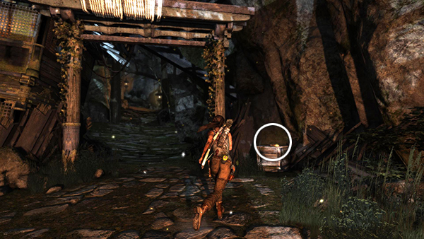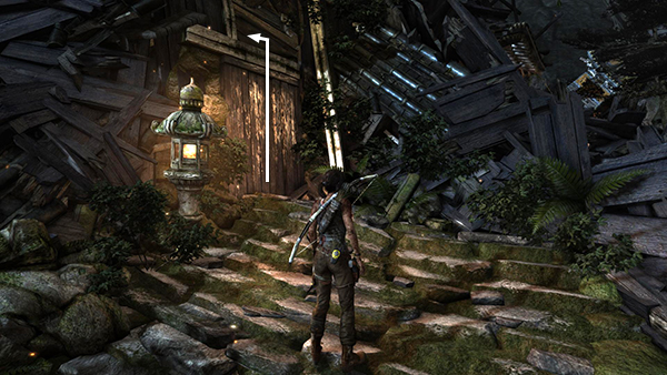 Turn so the cliff is behind Lara. Shoot the lantern (1/5) in the building above to unlock the Pyromaniac Challenge. This is the first of five such lanterns you can destroy for an XP bonus. There are more arrows and a salvage crate at the base of this building. Scramble up the wooden wall on the right to get into the building itself, where you'll find a GPS cache (1/2) and more arrows. (screenshot)