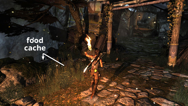 AMBUSH INSIDE THE BURNING BUILDING: Raid the food cache just inside and pick up more arrows if you need them. Shoot the lantern (4/5) to burn away the debris blocking the passageway. (screenshot) This lantern also counts toward the Pyromaniac Challenge.