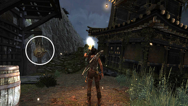 Return to the front of the building where you just shot the 2 enemies. Now head around to the left side of it. Hanging from the far corner of the building is another lantern (3/5) you can shoot for the challenge. Walk across the fallen tree, turn right and scramble up the wooden wall behind the building. Inside, on the upper floor, there's a trunk full of salvage plus more arrows. (screenshots)