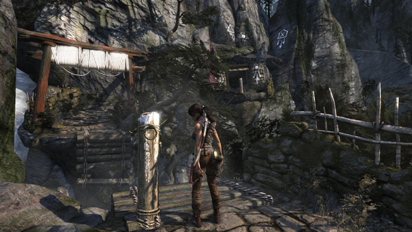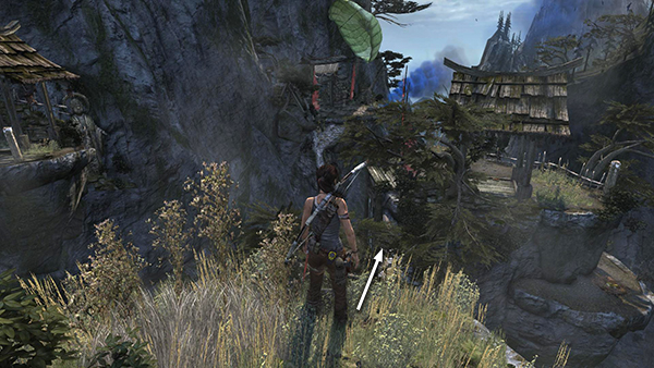 MOUNTAIN VILLAGE NORTHWEST LEDGES: When you're done talking with Roth and upgrading Lara's skills and gear, head down the rocky path to the end, where you'll find a post for anchoring a rope arrow. Shoot one into the archway below and slide down to the upper level of the village—an area that you weren't able to explore last time you were here. (screenshots)