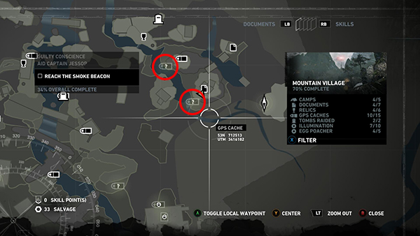 NOTE: When you finish this section of the Mountain Village, even if you've collected every possible item, you will still be missing a few of the relics, documents, GPS caches, and challenge items. You will return later, at which time you'll be able to retrieve a few previously inaccessible items and collect anything you may have missed before.