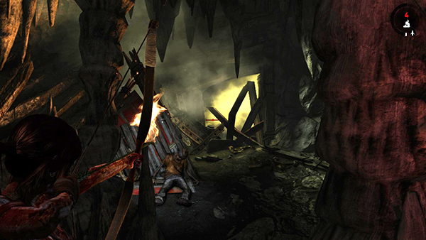 After wading out of the pool blood, continue up the gore-strewn path until you come to a relatively fresh corpse clutching a quiver of arrows. Lara managed to grab her bow before she escaped but no other weapons or ammunition. So pick up these few precious arrows and try not to waste them. Stand well back from the natural gas vent in the opening ahead and shoot a fire arrow into it. (screenshot) The explosion clears out the debris so you can pass. Move quickly through the tunnel. The toxic green gas will kill Lara if she breathes it for too long. Also, for obvious reasons, do not light your torch while exploring near one of these gas vents.