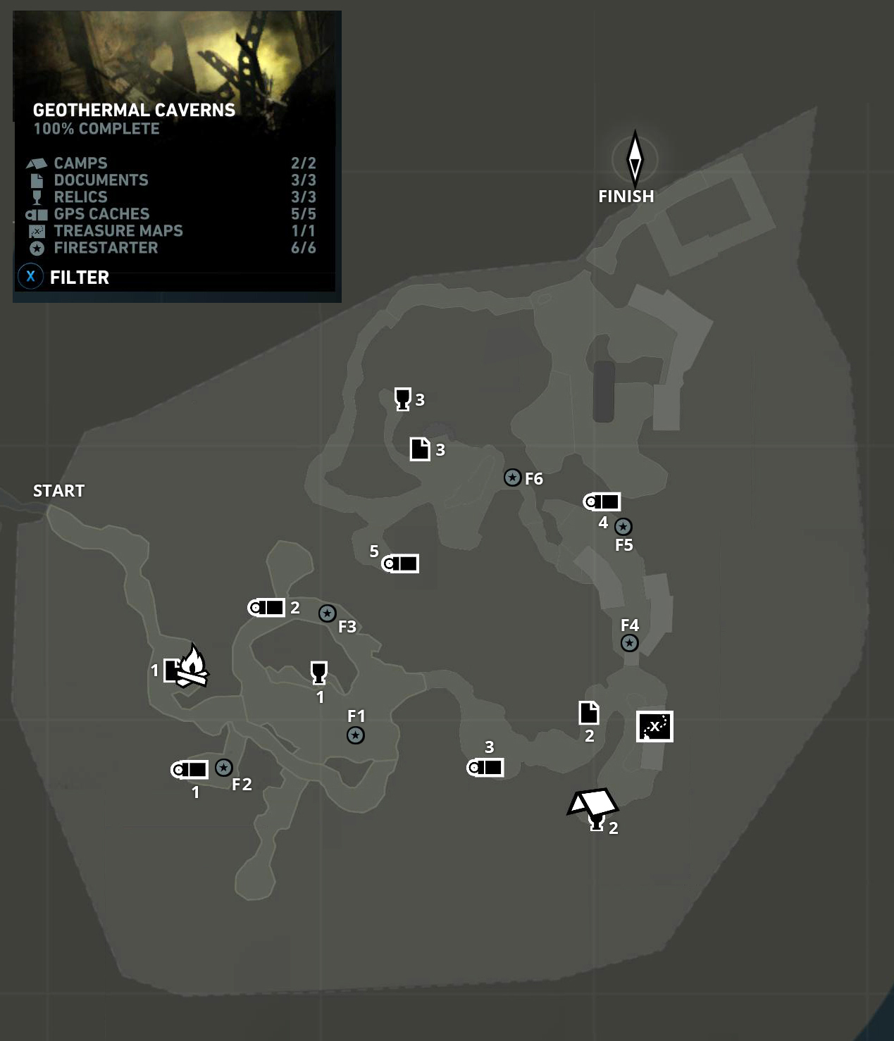 Documents: 3 Relics: 3 GPS caches: 5 Treasure Maps: 1
