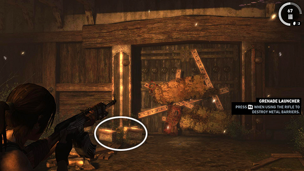 In the aftermath of the fight, Lara straps the grenade launcher onto her rifle. Handy! You receive 250 XP along with your new toy. There are 2 boxes of rifle/SMG ammo and a crate of grenades sitting on the ground to the left of the doorway. Grab them. Then follow the on-screen prompt to destroy the metal barrier: Stand well back from the door to avoid taking damage when the grenade explodes. Equip the rifle, hold the Aim button and instead of the regular fire button, press Alternate Fire to launch a grenade. (screenshot)