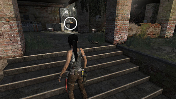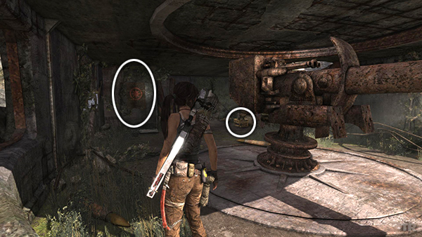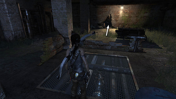 When Lara puts her weapon away, you'll know the area is clear for the moment. Loot the bodies on this side of the room and then move to the end of the walkway and jump across the gap. When you enter the room on the left, another bad guy appears behind you on the upper level. Turn around and take him out from the doorway. Then crack open the salvage crate and pick up 2 bundles of arrows, rifle/SMG ammo and shotgun shells. (screenshots)